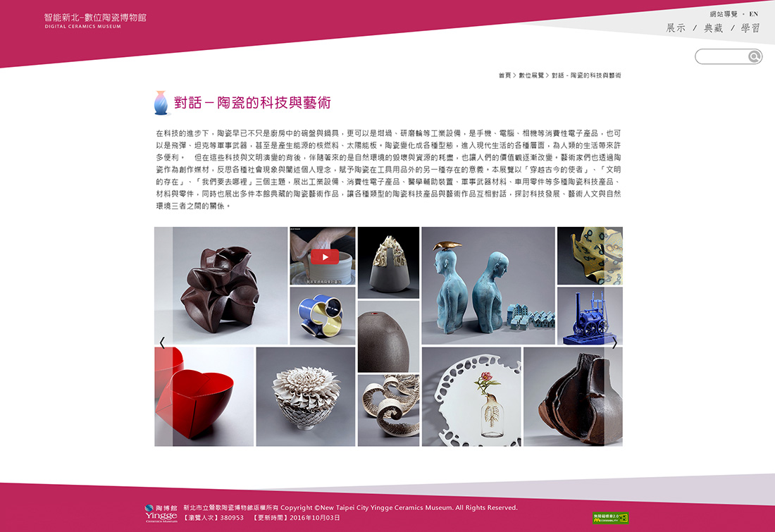 以優化數位服務機能為目標,提升大眾、師生多元教育學習陶瓷知識管道,充實數位典藏、文化走讀、共享資源、線上學習等熱門單元,豐富多元的線上探索與寓教於樂的功能。